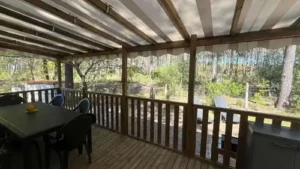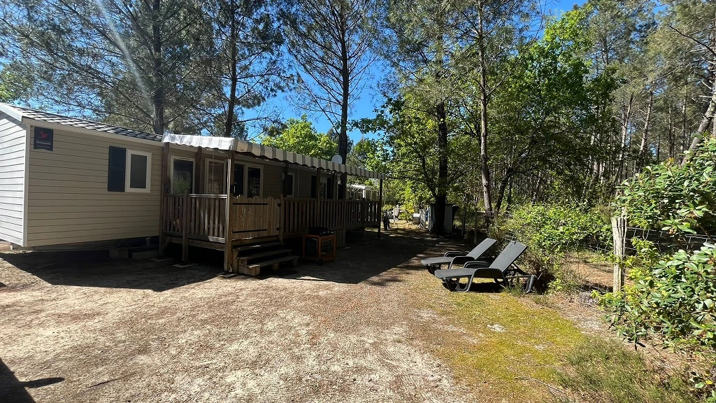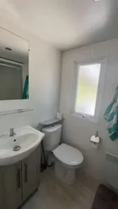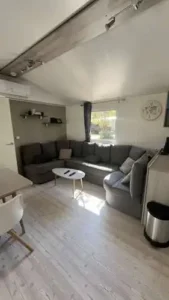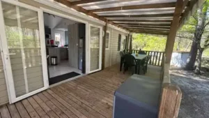 Ce mobil-home d’une superficie de 40 m2 comprend 3 chambres, 2 toilettes et 2 salles de bain.